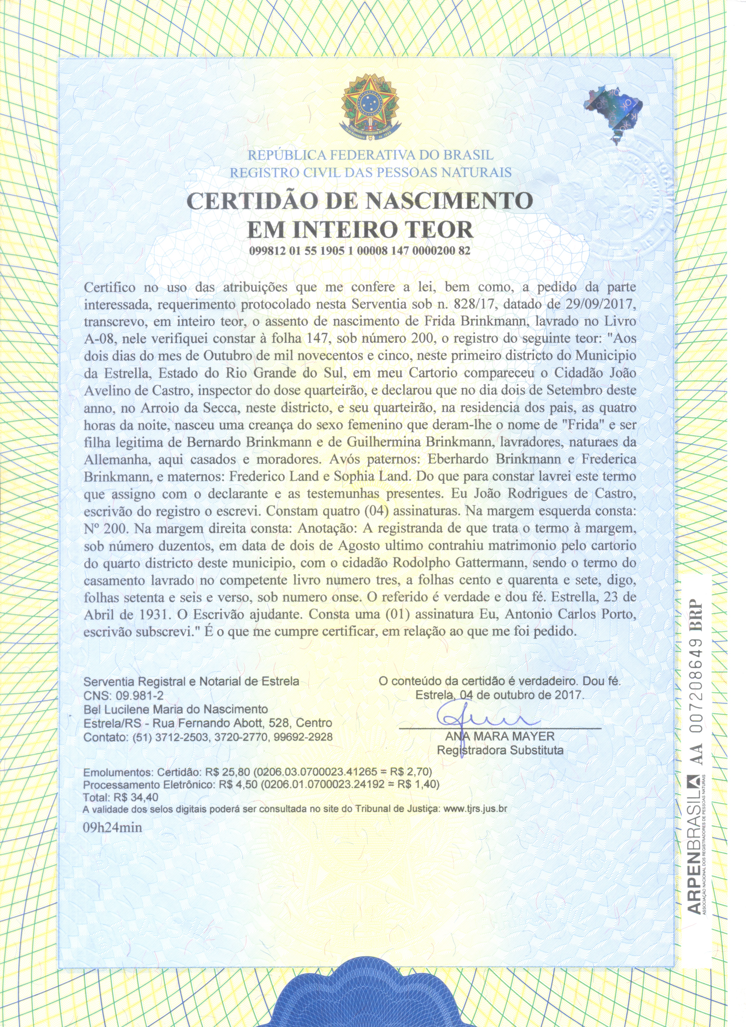 Frida married 1 Rudolfo Gattermann on 02/08/1930 in 4º distrito, Estrela, RS, Brasil. Rudolfo was born on 01/09/1904 in Estrela, RS, Brasil. He died on 06/09/1994 in Imigrante, RS, Brasil.